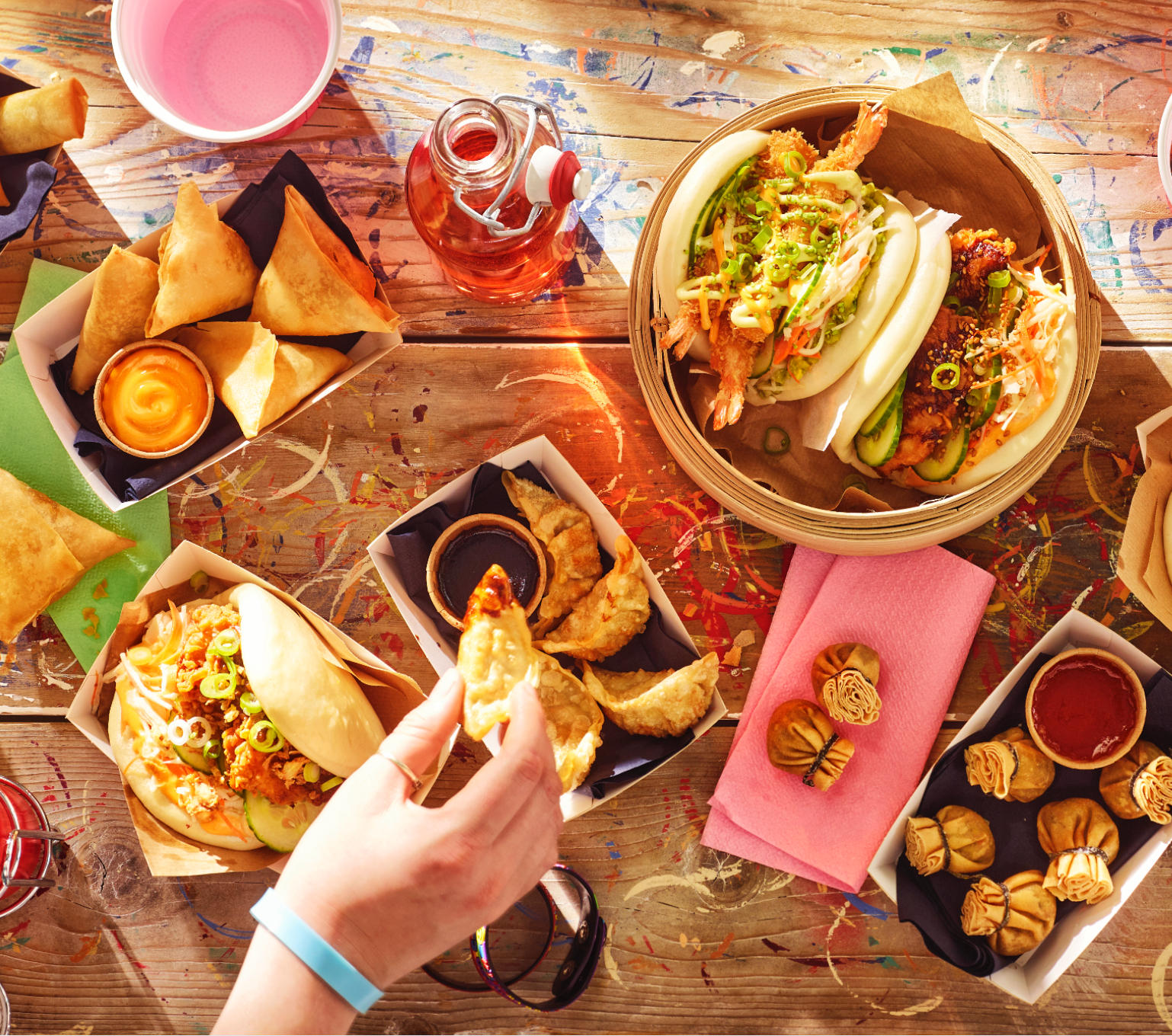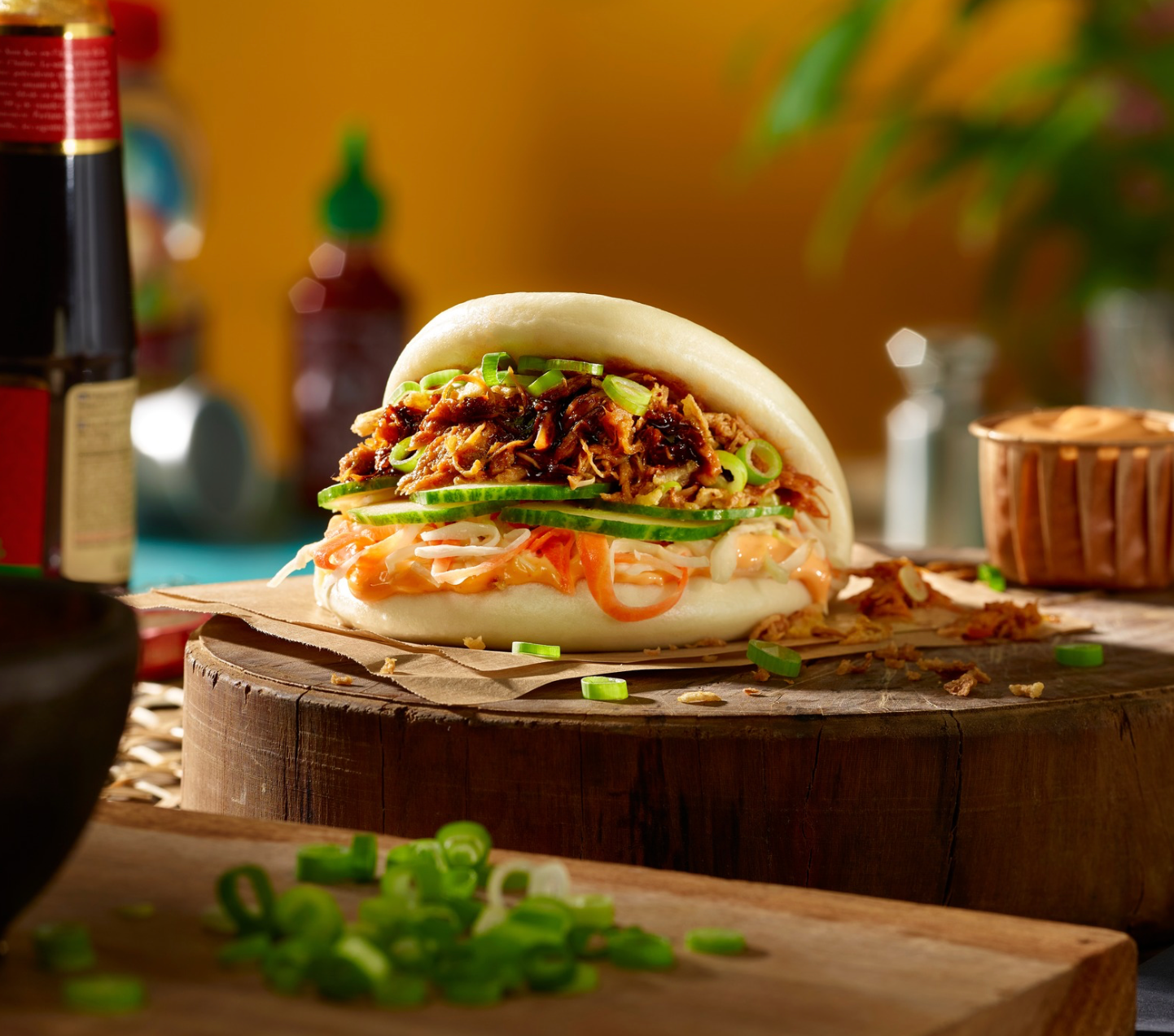 Langzaam gegaard varkensvlees, Aziatische bbq saus, koolsalade, sriracha mayo, ingelegde komkommer, bosui, gebakken uitjes